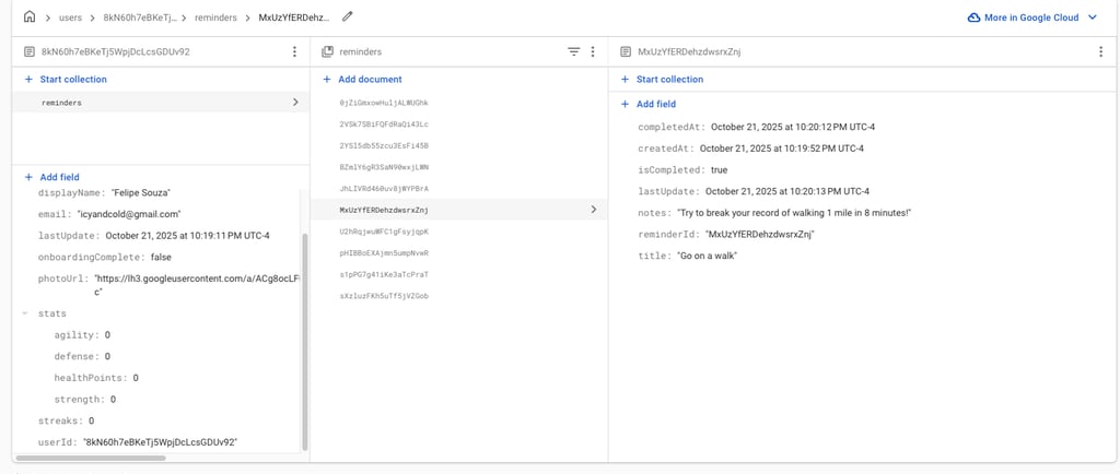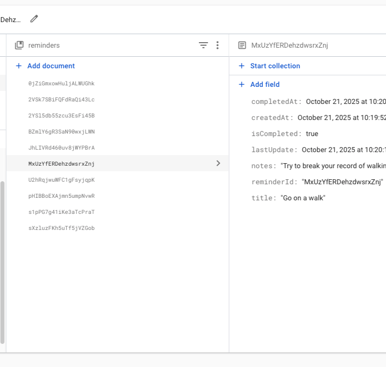 Most of the week was spent on the Firebase Reminders branch. I created a new Reminders collection in Firestore and wrote repository functions to create, update, delete and mark reminders complete/incomplete. The commit history shows the incremental additions: adding server timestamps when creating reminders, wiring up an updateReminderfunction to /users/{uid}/reminders, and automatically setting or unsetting the completedAt field when a user checks off a remindernewtab. To test these functions I added temporary buttons in TempScreens.kt that allowed me to invoke the repository methods and watch the results live in a debug view. This iterative approach helped me catch issues early—like forgetting to refresh the UI after an update—and ensured that the final implementation is robust.